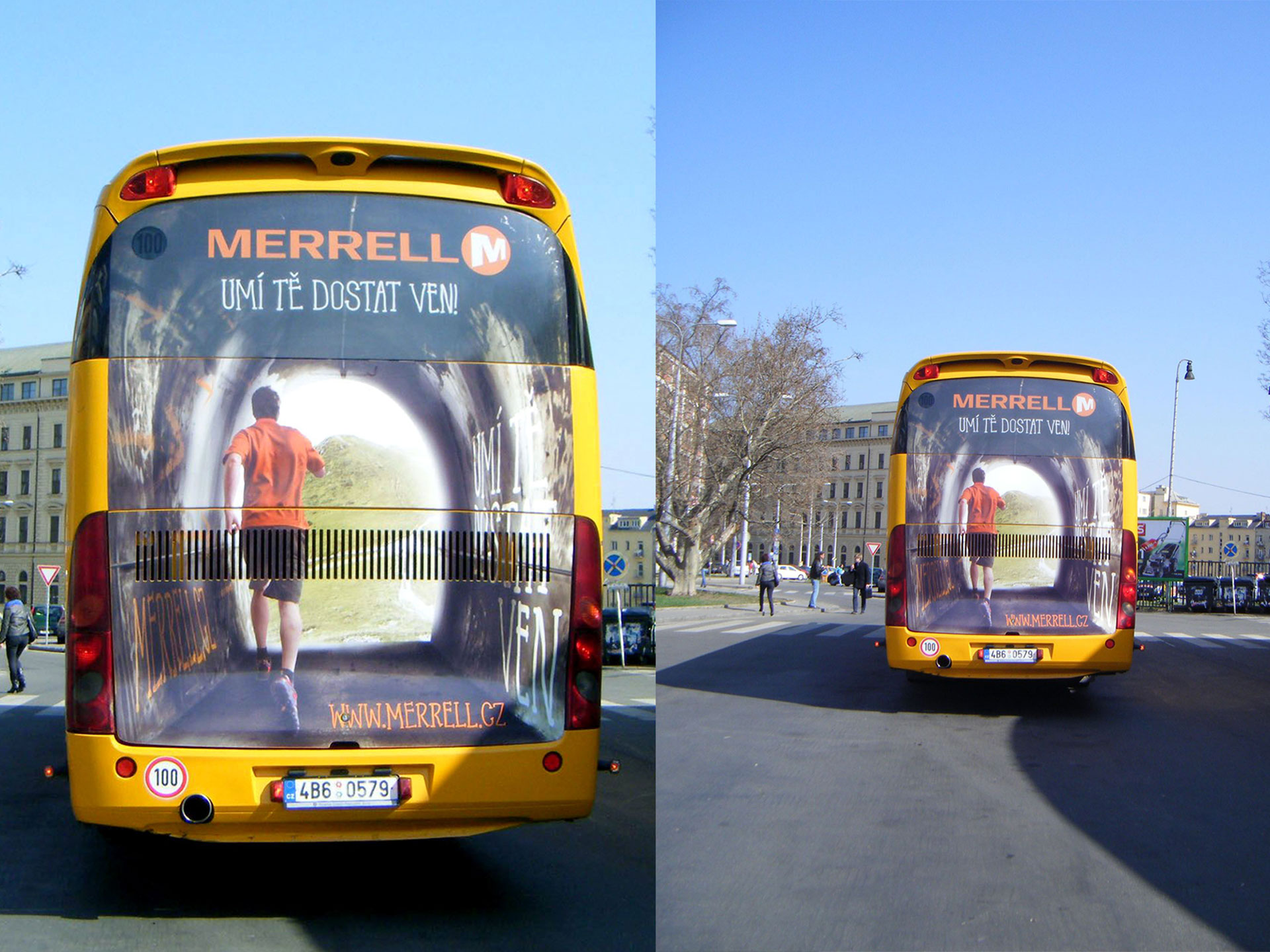 Jednou, když grafici PUXdesignu zrovna řešili polepy Merrell na zadní stranu žlutých autobusů, jdu kolem a říkám si: "Proč neudělat něco trochu víc než nalepovací reklamu?"